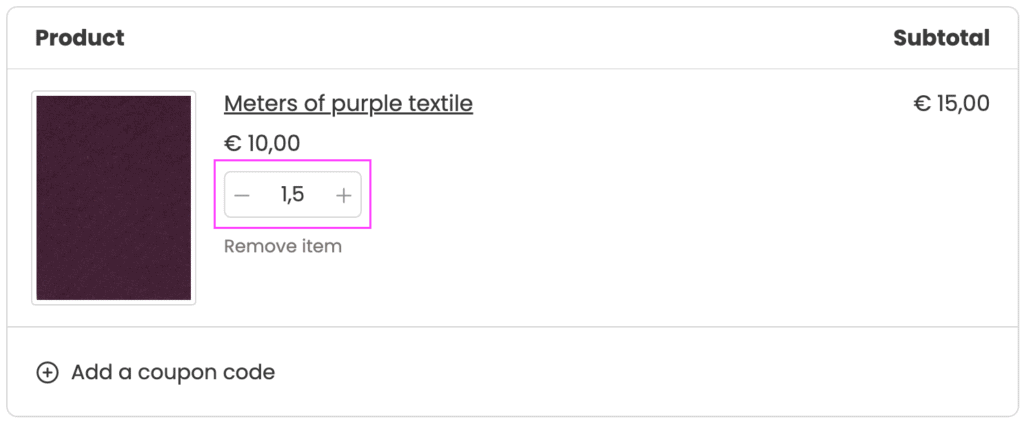 Once you have enabled decimal quantities on WooCommerce, you might need to configure Fluid Checkout PRO to allow decimal quantities on the optimized cart page and on the checkout page if the feature to allow customers to edit cart quantities at checkout is enabled.