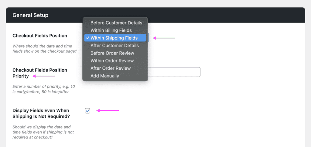 In case you have the option “Display Fields Even When Shipping Is Not Required” checked and the position set to “Within Shipping Fields” in the WooCommerce Delivery Slots plugin settings, the delivery slots fields section will be automatically changed to “Within Billing Fields” as the shipping step is not displayed in this case.