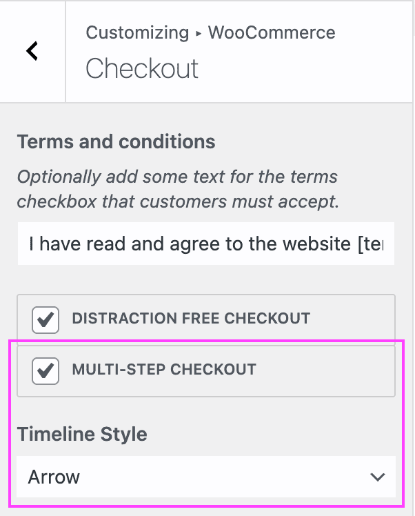 The “Multi-step Checkout” feature and related “Timeline styles” options from the OceanWP theme will be automatically disabled. Changes to these settings will have no effect on the checkout page when using Fluid Checkout.