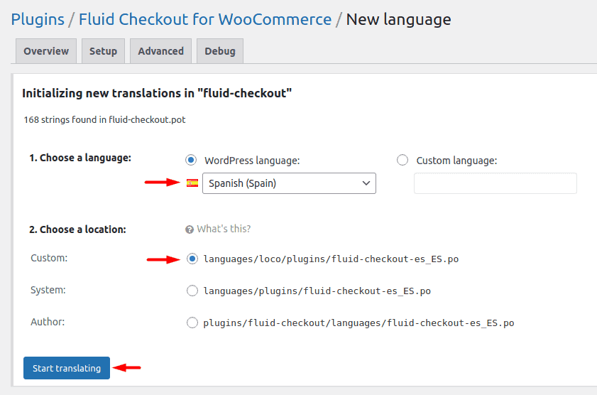 We recommend you select the “custom” and keep the Loco translate plugin active after you finish translating. This will ensure your translation files won’t be deleted or overwritten with future Fluid Checkout updates or with translations from the WordPress directory.