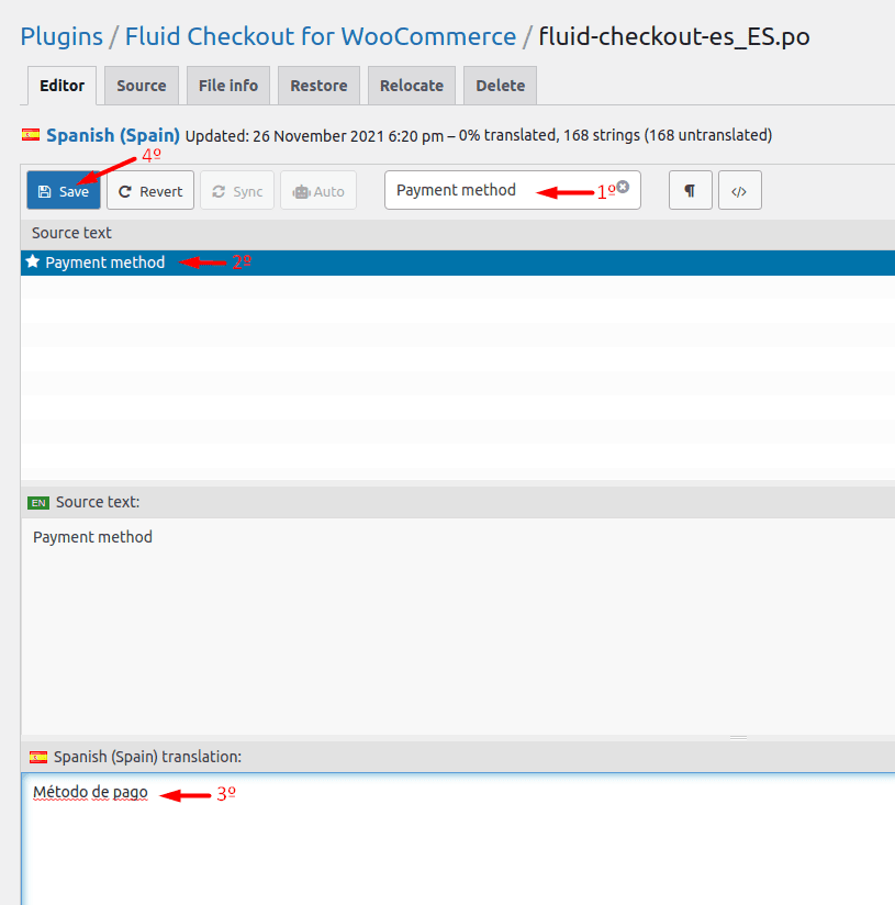 Please note that after a new version of Fluid Checkout is available, you might need to hit “Sync” button when editing the translation to your language to update the existing original text available for translation.